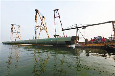 7月27日,徐州駱馬湖水源地第三標(biāo)段施工現(xiàn)場(chǎng),中鐵上海局市政公司員工冒著酷暑在湖中心吊裝最后一節(jié)內(nèi)徑2.6米、長80.4米、壁厚28毫米的原水取水管道。大口徑長距離鋼管引水管線最后一節(jié)的就位,標(biāo)...