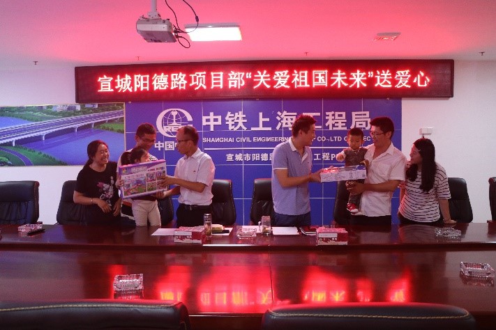 項目兩位女員工與丈夫不在一個項目部,獨自帶小孩工作生活,工程項目繁忙,家庭也不能團聚,為使員工子女過上一個有意義的兒童節,把項目“職工小家”建設工作落到實處,項目部特意為小朋友挑選適合的禮物。6月1日,項目黨支部書記賈述榮代表項目部向2名小朋友送去節日禮物,在為小朋友們送去祝福的同時,也向員工的辛勤工作表示了衷心感謝,并特意給她們放假半天,帶孩子走出項目部開展親子互動活動,項目青年員工與2名小朋友進行了互動游戲。