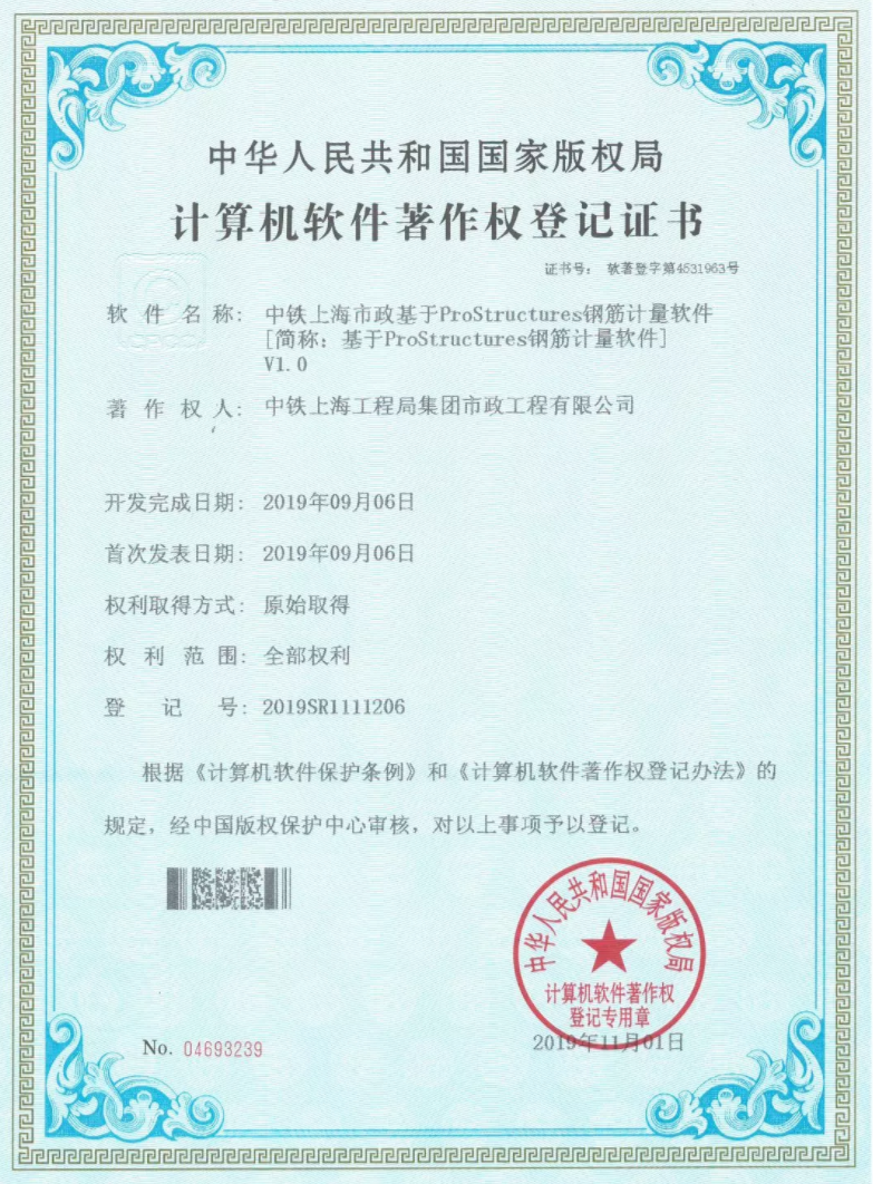 近日,從國家版權局傳來喜訊,公司技術創新工作又獲新突破!公司自主研發的“中鐵上海市政測量放樣記錄軟件”“中鐵上海市政基于ProStructures鋼筋計量軟件”通過中國版權保護中心審核,獲得國家版權局計算機軟件著作權授權,并取得了著作權登記證書。計算機軟件著作權是企業科技研發工作的一項重要指標,此次一次性獲批兩項國家版權局計算機軟件著作權,是公司高度重視軟件及信息化技術開發的成果,表明公司自主研發取得的獨立知識產權得到了權威認可和肯定。